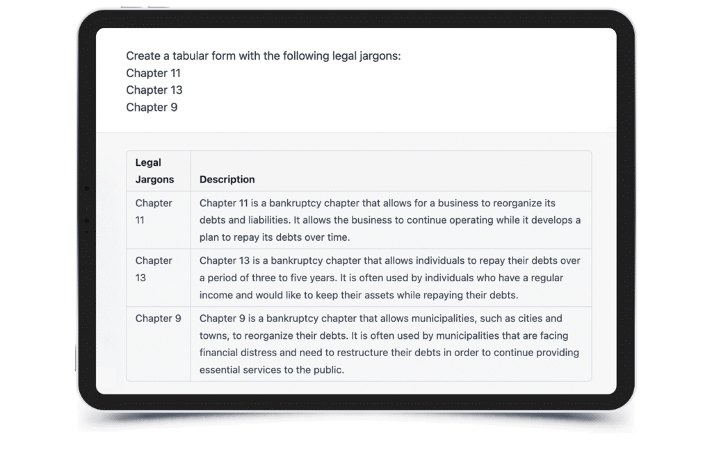 1. Type “Create a tabular form with the following…”. For example: “Create a tabular form with the following legal jargon: