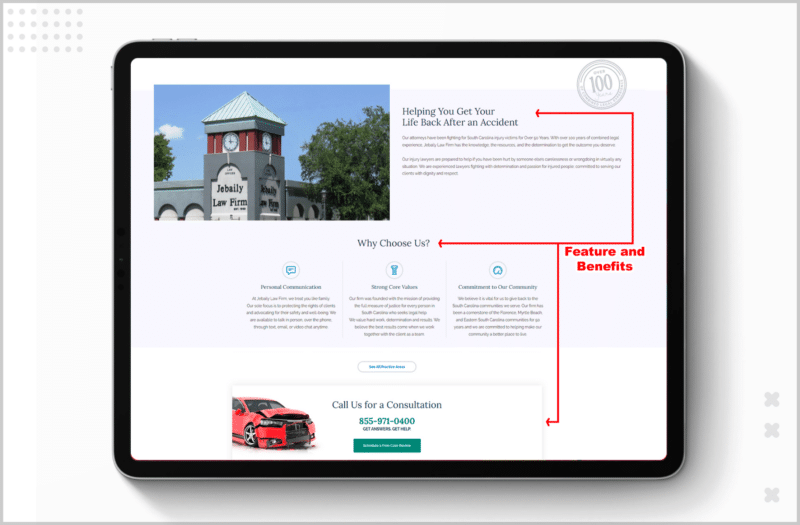 Here’s an example of the previous homepage features, which can be found on Jebaily Law Firm’s Homepage: