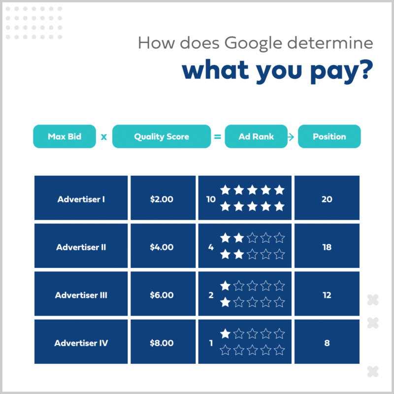 The two factors then give Google the ad ranking score and based on that, Google’s bidding strategy decides who gets the first position, second, etc. Here’s a visual representation of what we mean: